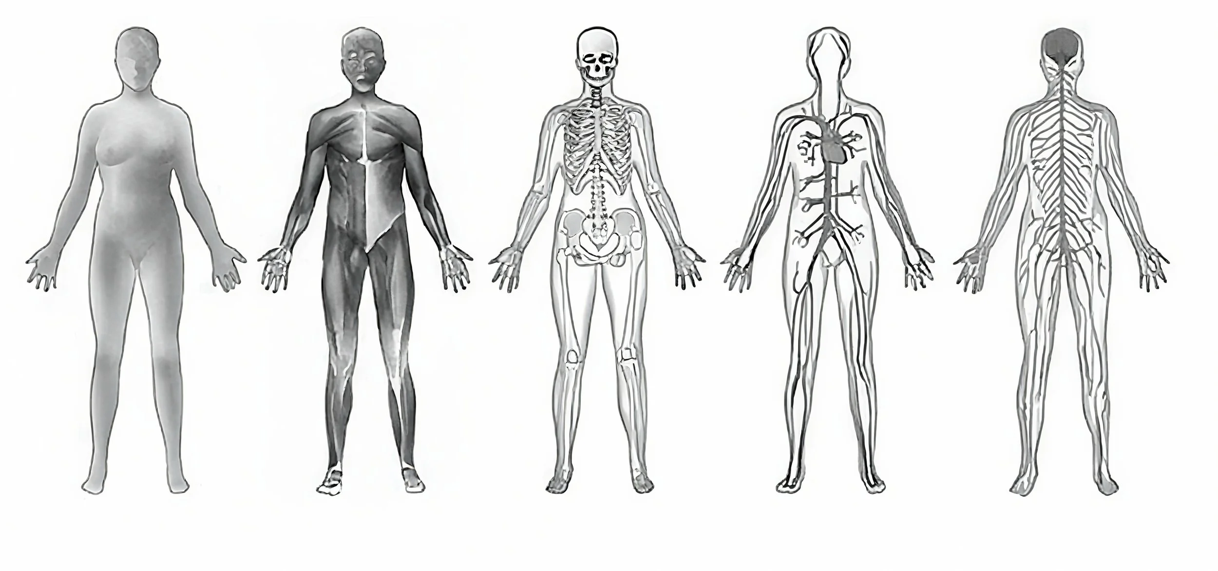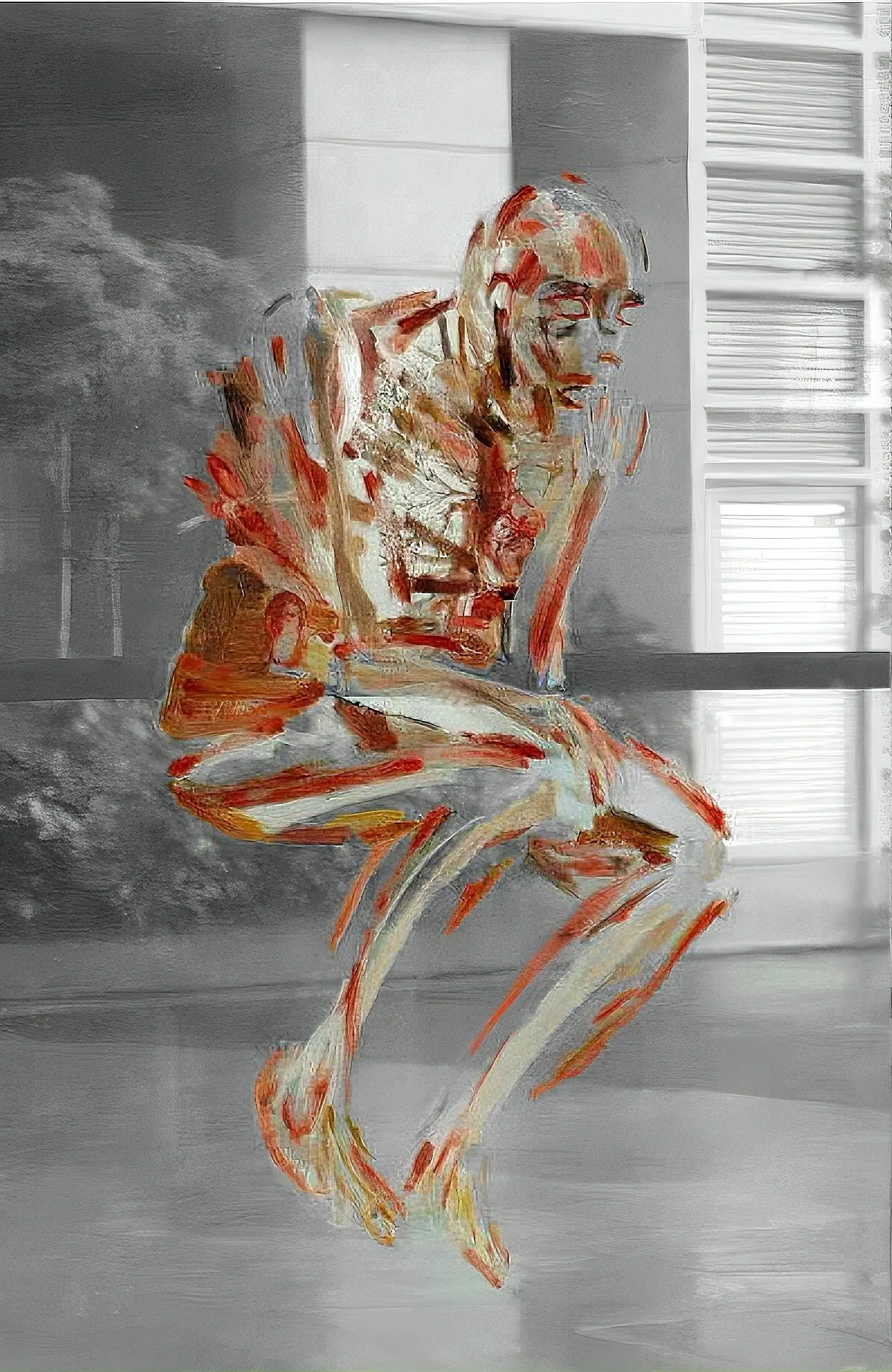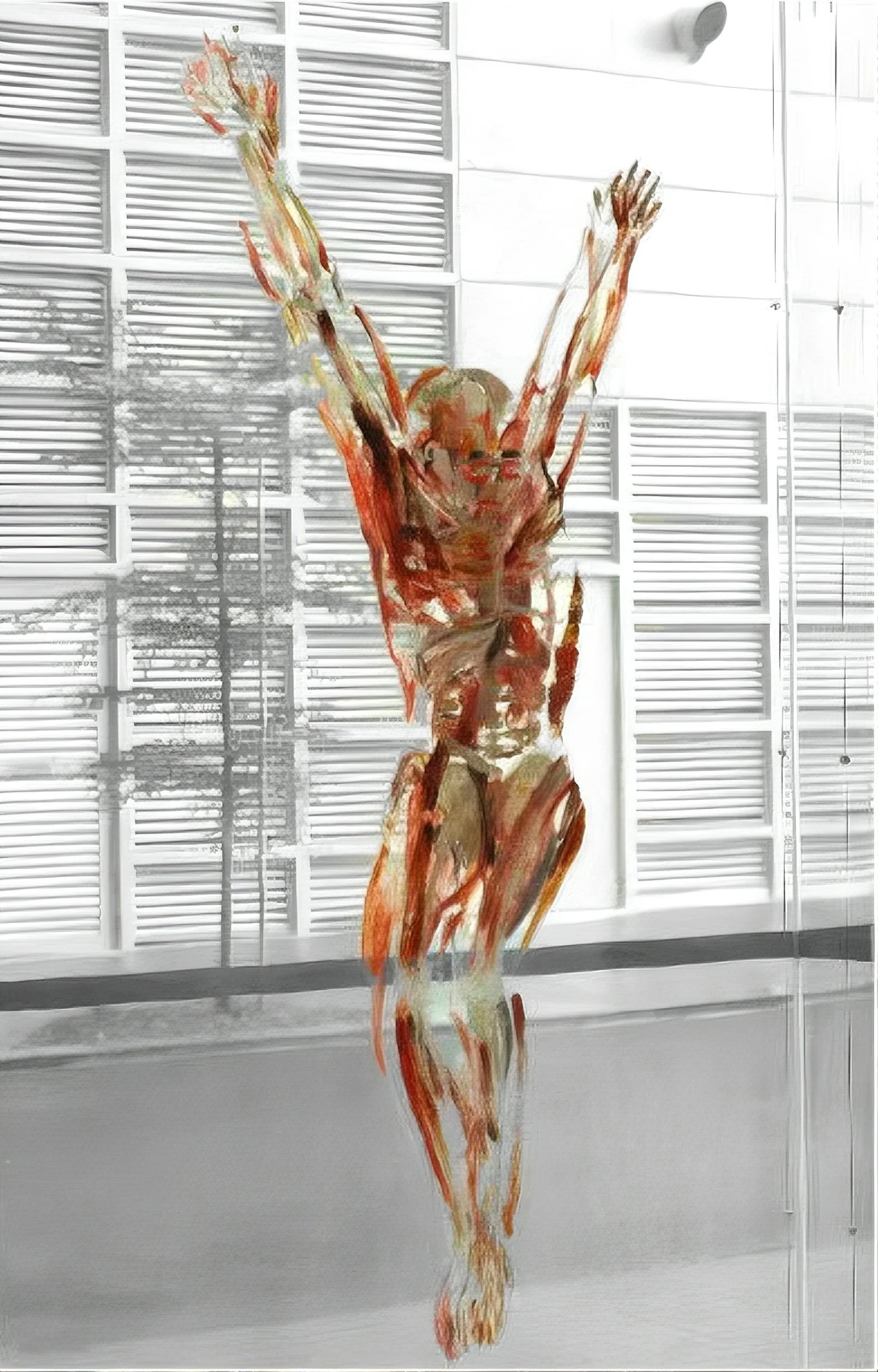 The artist devises a system of depiction: painting by body systems on plexiglass sheets. Muscular, skeletal, organic, circulatory body systems are painted on separate surfaces. The front and back of each plexiglass are painted sparingly but sufficiently to impart the form of the figure by relying on the viewer to complete the image cognitively.