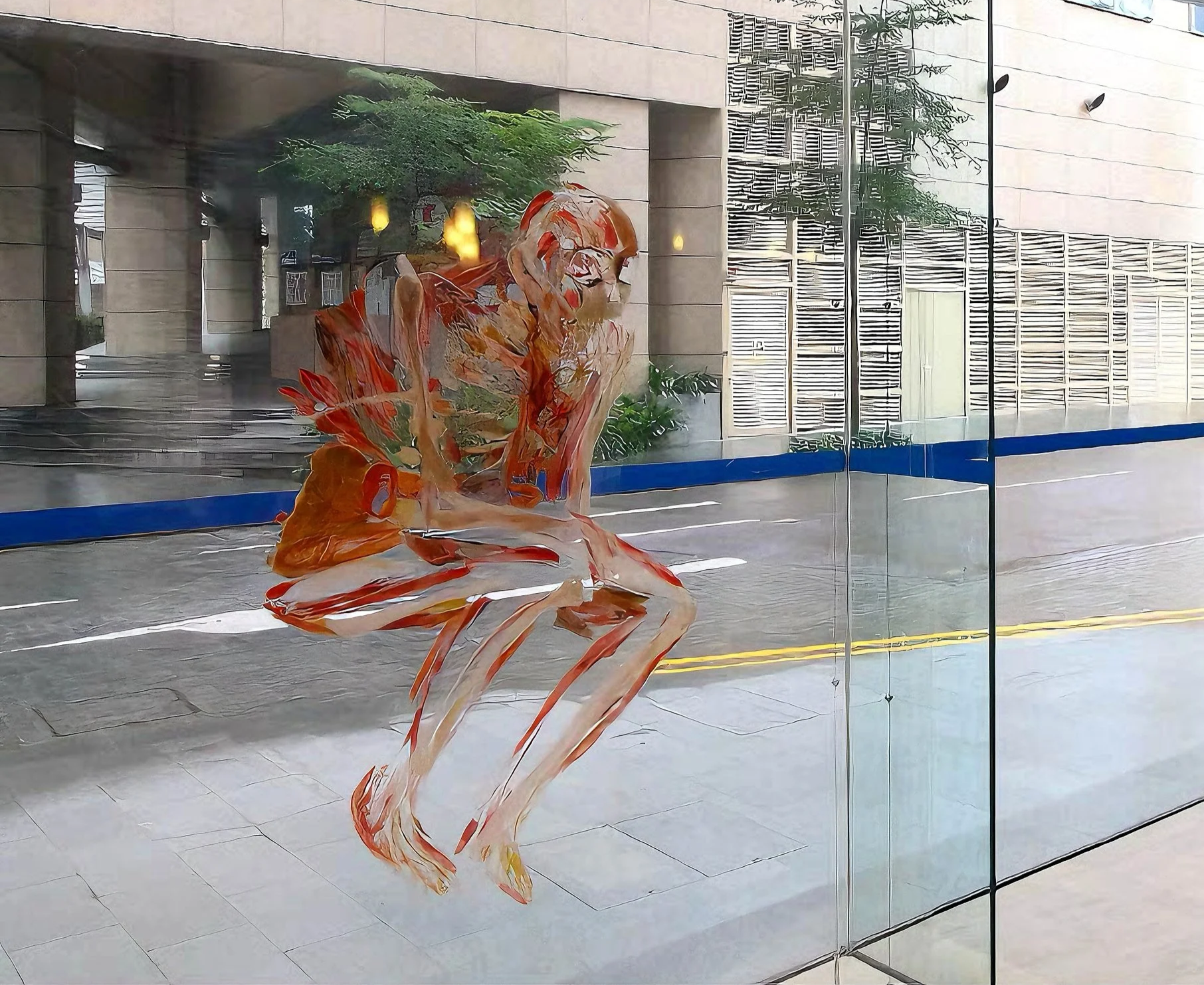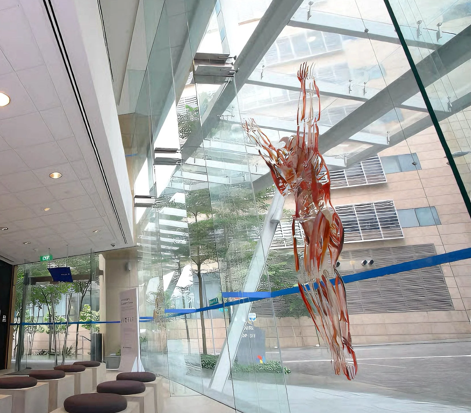 Depending on the various combinations of superimposition, separation, juxtaposition, and composition, different images are formed for viewing. The plexiglass sheets are also reversible, allowing a different view from the other side. The transparent plexiglass sheets allow a suspension in space and blending with the glass façade.